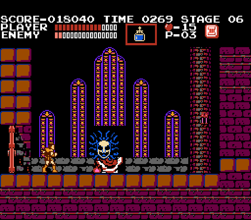 Alors que d'autres comme Death ou Frankestein vont faire beaucoup plus mordre la poussière...Evidemment si on meurt contre un boss, on recommence au début du stage de ce boss, c'est plus drole! Il faut savoir que les sauts se font bien sur au millimètre près, que Simon Belmont est très rigide à manier, que les ennemis ne vous laissent souvent aucune chance...Bref vous mettrez un moment à voir Dracula, et surtout à le battre!