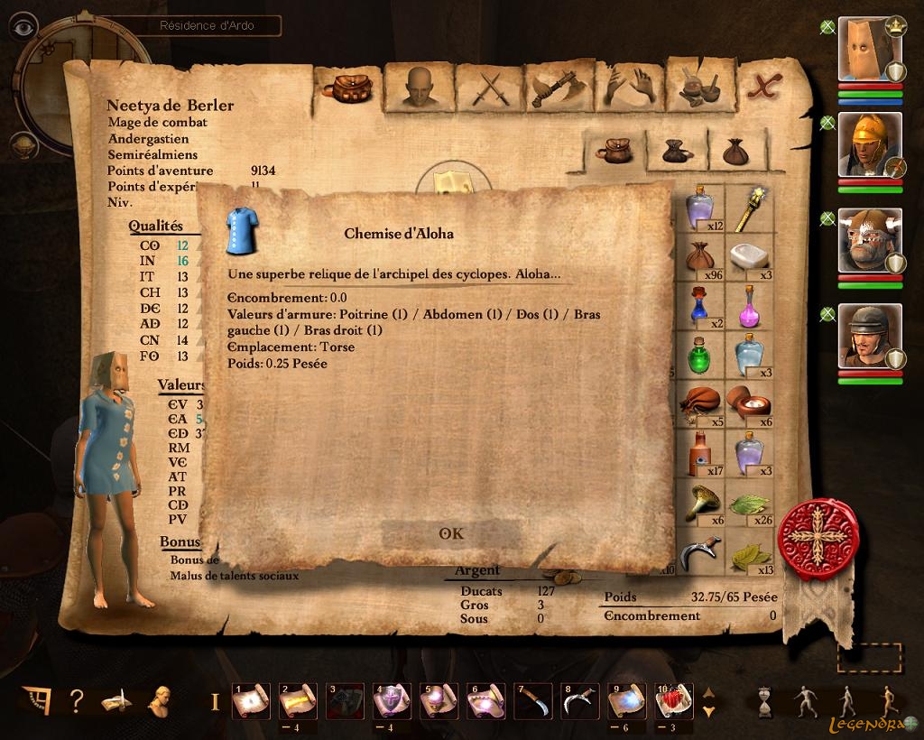 Ensuite, sachez que vous trouverez un certain nombre de maîtres au cours de votre aventure et qu'ils pourront vous apprendre les compétences spéciales de combat mais aussi des sortilèges, des talents ou bien le maniement des armes. D'ailleurs, cet apprentissage n'est pas uniquement disponible pour votre personnage, vous aurez aussi le contrôle complet de vos compagnons d'aventure. Ce qui revient à dire que vous ferez exactement ce que vous voudrez de votre équipe. Même si au premier abord vous n'aurez que peu de choix de compagnons, vous en recruterez un certain nombre durant vos pérégrinations. A chaque fois, ils iront vous attendre à Ferdock et vous pourrez en changer à loisir en retournant les voir. A la manière d'un jeu Bioware, vos compagnons en stand-by accumulent les points d'expérience au même titre que votre équipe active, ils ne seront donc jamais complètement à la ramasse (sauf peut-être au niveau de l'équipement). Forgrimm s'en occupeVos compagnons d'aventure seront tout aussi importants que votre personnage durant le jeu, simplement car ils seront d'une puissance équivalente. Et comme d'habitude, l'union fait la force. Ajoutons à ceci qu'ils sont tous plus ou moins développés en terme d'histoire personnelle. Dans l'ensemble, ils sont assez attachants, et ont régulièrement des choses à dire suivant les situations dans lesquelles on se trouve (en découvrant le temple de Rondra à Ferdock, Rhulana aura son mot à dire par exemple). D'ailleurs, les doublages sont plutôt réussis, fait assez rare pour être souligné. Bien entendu, le jeu a été entièrement traduit et doublé en français et malgré quelques fautes, la traduction est réussie. Vos compagnons auront aussi souvent des choses à dire à chaque fois que vous les solliciterez (d'un clic de souris, les expressions sont assez répétitives au final).