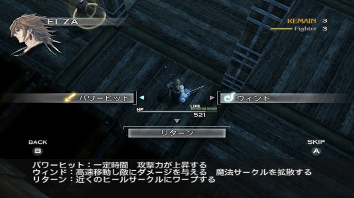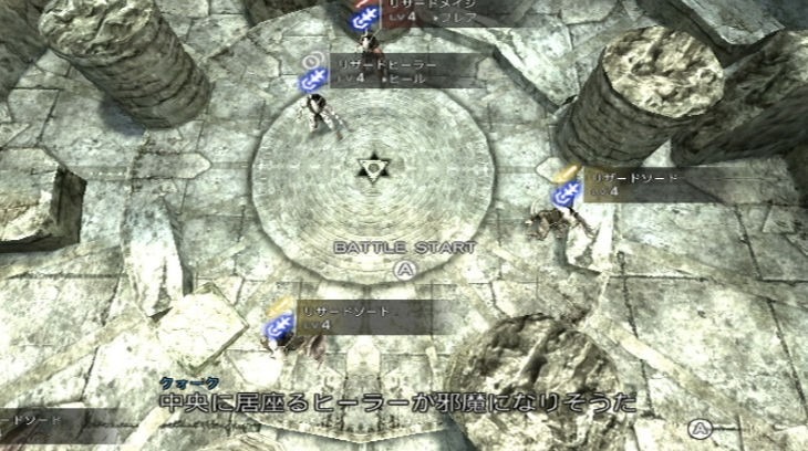 Le gameplay se base en partie sur un mécanisme appelé "seek mode". Une fois ce dernier activé, vous passez en vue à la première personne avec un curseur au centre de votre écran. Ainsi vous pourrez interagir avec l'environnement et en tirer profit, je m'explique. Lorsque vous passerez ce curseur sur un élément clé du décor, que ce soit en combat ou en ville, des events se déclencheront. Admettons qu'un pilier fragilisé se trouve dans votre entourage lors d'un affrontement et qu'il soit possible de s'en servir (généralement indiqué par une cible), un petit coup de seek mode dessus et vous aurez l'opportunité de demander à vos alliés de le faire s'effondrer sur vos adversaires. Et ceci n'est qu'un exemple parmi tant d'autres tant le level design du soft paraît réussi. En effet, chaque combat ou phase d'exploration est pensé différemment selon la zone dans laquelle vous vous trouvez, ce qui implique une certaine diversité dans l'usage des décors. Ainsi tous les affrontements ou presque reposent sur une potentielle tactique différente pour anéantir l'ennemi. Il n'est cependant pas obligatoire de se servir constamment de l'environnement mais c'est un avantage non négligeable durant de nombreuses batailles, lesquelles reposeront également sur un certain aspect tactique. Alors qu'avec la précédente description, on jurerait se retrouver en plein cœur d'un Action RPG, c'est sans compter sur la voie qui semble être empruntée par The Last Story : l'hybridation. Le genre tactical vient donc s'immiscer dans ce mélange afin de donner un côté réfléchi aux joutes énergiques du soft. Ainsi avant certaines batailles qui vous mettront aux prises avec bon nombre d'ennemis, le jeu est stoppé et vous passez en vue de dessus (typiquement tactical) afin de pouvoir examiner attentivement le champ de bataille et de noter les caractéristiques de l'ennemi qui sont affichées au dessus de leurs têtes telles que leurs éléments ou bien leur genre (caster, tank, archer...). Tout cela permet d'envisager de façon intelligente la bataille à venir, sans se casser les dents sur l'ennemi et en se servant du mieux possible des décors. On ajoutera à cela quelques notions d'infiltrations comme la planque derrière les objets du décor qui vous permet de surgir par derrière ou encore les phases d'infiltration pures ou le silence et la discrétion seront de rigueur pour annihiler vos ennemis sans alerter la meute. Mais au final, on peut se demander si The Last Story ne fait pas non plus dans le Classical-RPG. Car en effet, il sera possible à tout moment de littéralement stopper le court du combat, mettant de ce fait en "pause" le jeu, et de sélectionner les actions que devront exécuter vos coéquipiers et vous même. De même qu'attaquer ne nécessite pas d'appuyer à répétition sur un bouton, mais simplement d'avancer vers l'ennemi, donnant par là un certain aspect automatisé qui correspondrait plus au Classical-RPG qu'à l'Action-RPG. The Last Story prend donc le parti de mélanger les genres et semble réussir le pari d'en faire un melting-pot détonnant. Ingénieux est le premier mot qui viendrait à la bouche du joueur qui découvre cette harmonisation des styles. Ça présage du bonEt on aurait presque envie de continuer à lui jeter des fleurs, en citant notamment la très bonne régularité des combats, leur mise en scène réussie (quelques QTE, dialogues à foison, de bons effets visuels...), ou encore le système de magie qui permet d'enrichir encore un peu plus un gameplay déjà bien complet après quelques heures. De la façon dont l'avait initié Final Fantasy Crystal Chronicles: Ring of Fates ou Tales of the Abyss, les magies laissent une trace circulaire sur le sol et vous pourrez combiner des sorts en superposant des cercles de différents types. A noter également qu'il sera possible de faire acquérir à votre arme l'élément correspondant à cette magie en passant simplement dans ledit cercle, la dimension stratégique ne cessant ainsi de grandir.