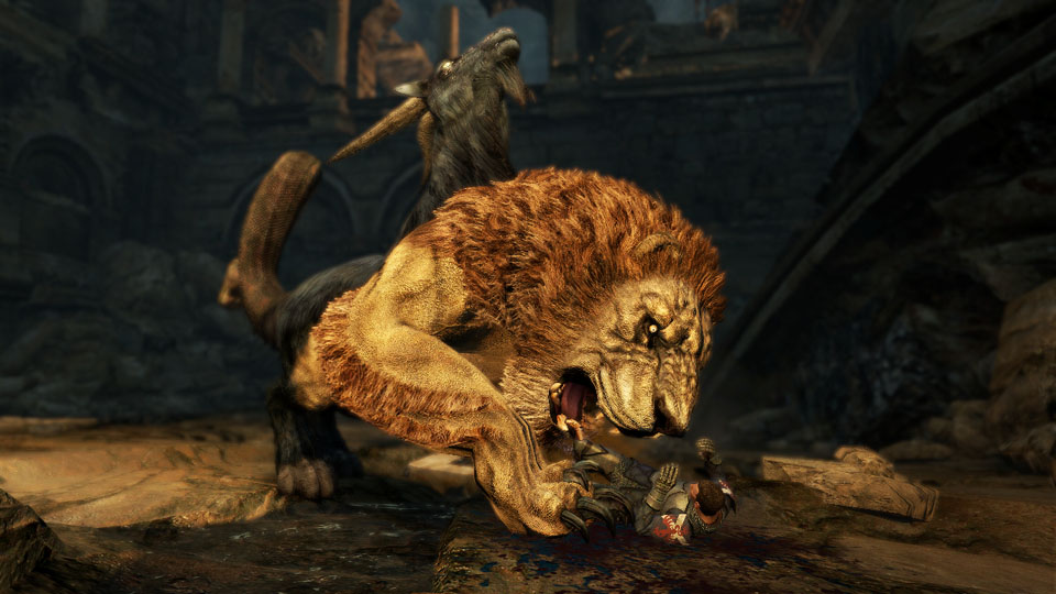 Un premier combat donc, et déjà les premières constatations : c'est nerveux, c'est bourrin, presque style arcade, quand même un peu bordélique par moment, les coups pleuvent, on pousse un soupir de soulagement en voyant que ce n'est heureusement pas du Monster Hunter-like et que c'est bien plus dynamique qu'un combat "basique" de W-RPG ; on regrettera cependant une raideur certaine dans la mobilité du personnage et l'absence de mouvements comme la roulade ou l'esquive pour dynamiser un peu plus tout ça (des mouvements apparemment plus liés à des classes précises, comme le rôdeur). On note également l'absence d'un lock qui va demander un peu plus d'implication du joueur, ce qui n'est pas une mauvaise chose. On se surprend même de l'efficacité de l'IA grâce à ce premier allié de fortune (les fameux Pions) : tantôt en sortant le joueur d'une situation dangereuse, tantôt en immobilisant une cible pour qu'elle soit abattue, tantôt en dévoilant un point faible de l'ennemi... étonnant, et très efficace. On essaiera également d'accéder à l'inventaire via select, un inventaire relativement classique et limité en place (apparemment propre à la partie aventure/exploration, d'ailleurs chaque personnage du groupe - Pion compris, donc - a son propre cheptel d'items) qui n'offre malheureusement aucun raccourci directement in-game - et pour cause, TOUTES les touches de la manette sont affectées au maniement du personnage! - et qui oblige à casser l'action si le besoin d'un soin ou d'un changement équipement se faire sentir. La progression continue, la prochaine étape étant un court arrêt à une curieuse stèle qui deviendra vite familière à ceux qui continueront l'aventure avec la version finale du jeu : celle-ci permet d'invoquer des Pions. Un archer et un mage s'intègrent alors au groupe, et le HUD prend une place encore plus imposante avec tout ce petit monde qui va papoter. Heureusement, tout est configurable dans les options, le jeu offre même le luxe d'offrir 7 configurations manette différentes. Un groupe qui continue à s'enfoncer dans les ruines pour finir bloqué dans une antichambre malheureusement pas vide: une Chimère en furie attend. Le combat s'engage contre l'animal mythique à trois têtes, et c'est là que Dragon's Dogma démontre tout son potentiel.