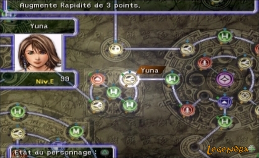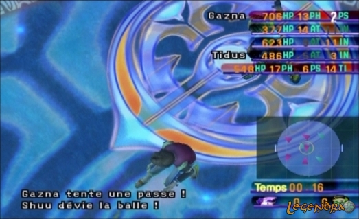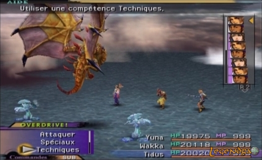 L'histoire est, donc, celle de Tidus, star de Blitzball (sport aquatique ressemblant à du water polo en plus spectaculaire, à peu de chose près) de sa ville natale : Zanarkand. Le jeu commence sur une scène cinématique mettant en scène notre fameux joueur. Le match se déroule normalement jusqu'à ce qu'une énorme masse d'eau vienne troubler les festivités. Cette "chose" (vous apprendrez plus tard qu'il s'agit de Sin) détruit tout sur son passage. On découvre alors Auron, un personnage d'une classe folle, soit dit en passant, qui ne semble pas vraiment surpris de cette arrivée impromptue. Pour info, Auron est l'un des anciens amis du père de Tidus, Jecht, qui a disparu quelques années auparavant dans de mystérieuses conditions; Tidus a toujours détesté son père. Tidus, lui, se rend compte en plein match (durant un saut périlleux arrière) que quelque chose ne tourne pas rond. Tout se déroule alors extrêmement vite et Tidus se voit, en quelques secondes, retenu par une seule main à un pan de l'arène de blitz. Il fait alors une formidable chute. Le jeu commence... Auron vous sollicite en vous demandant de le suivre. Vous prenez, ensuite, connaissance avec les systèmes de combat via un tutoriel interactif. Pendant les entres-phases de ce tutoriel, vous êtes sujet à d'étranges visions. Vous voyez un gamin avec une capuche lui recouvrant la moitié du visage vous sortir des phrases bizarres qui ne semble pas, à ce moment du jeu, vouloir dire grand chose pour vous. Le tutorial prend fin et vous êtes aspiré dans un monde parallèle. Après quelques heures de jeu, vous vous retrouvez au sein d'un groupe d'aventuriers dont le personnage central est Yuna, une magicienne seule capable d'invoquer les Aeons (chimères en fr) et également seule capable de vaincre le fléau qui pourrit également ce monde : Sin. Votre aventure tournera donc essentiellement autour de cette quête principale : la destruction du mal en la personne (ou devrais-je dire "la chose") de Sin, une espèce de grosse baleine ne ressemblant pas à grand chose. Final Fantasy X, une histoire d'amour et de haine dans un univers merveilleux du nom de Spira, a déjà commencé. Pour ceux et celles qui verraient en l'histoire de FFX un vulgaire amas de clichés Pop issus des romances hollywoodiennes, je voudrais dire ces quelques mots : ils se gourent complètement. FFX comporte l'une des critiques la plus âpre envers la religion jamais vu dans un jeu vidéo. A la manière de Xenogears, l'histoire n'épargne pas l'Église, en tout cas de la manière dont elle est représentée dans le jeu. Gameplay parfait ?Nous allons dans les lignes qui suivent décrire et critiquer le gameplay de ce FFX. Sachez que, tout d'abord, ce FF n'a rien à voir en terme de gameplay aux précédents opus. Même si les rencontres avec les monstres restent aléatoires, le système de combat et d'évolution n'a rien à voir avec ce que vous avez déjà vu à présent (remarquez, en ce qui concerne le système d'évolution, aucun FF ne se ressemble). Ce nouveau volet introduit un système de combat tout à fait original nommé CTB ( combats en tours de battement). Fini l'ATB (Active Time Battle) et sa jauge qui se remplit au fur et à mesure du combat. Alors, quoi de neuf, docteur? Eh bien, beaucoup de choses, cher patient ! Tout d'abord, on observe une disparition de la jauge de l'ancien ATB au profit d'une sorte de grille de classement (AHH, ça m'énerve de ne pas trouver de mots pour décrire exactement ce que c'est) qui détermine qui va agir, et quand. Les personnages et monstres sont représentés par une icône, et quand cette icône représentant le personnage ou monstre arrive en haut de cette grille, c'est à lui d'agir ! J'espère avoir été clair et ne pas vous avoir embrouillé (oui, je sais, c'est pas gagné). Le système d'évolution se nomme quant à lui "sphérier". Je m'explique, à la fin de chaque combat, vous obtenez des sphères de différentes sortes (certaines sont destinées à l'attaque, d'autres à la défense ou encore à la magie) qui vous permettent de remplir des "trous de sphère" correspondant à ces différentes sortes. Une autre chose, vous obtenez à la fin de chaque combats des points d'évolution. Arrivés à un certain nombre, ces points vous octroient un "niveau d'évolution" qui déterminera de combien de cases vous pourrez vous déplacer dans le sphérier. A deux niveaux d'évolution, vous pouvez vous déplacer de deux cases, à trois niveaux, trois cases, etc. Le sphérier en lui-même est réellement immense et il vous faudra de très nombreuses heures si vous voulez le compléter dans sa totalité. Dans le sphérier, chaque personnage a une zone qui lui est propre et qui correspond à sa classe (logique, vous ne voudriez pas qu'un attaquant devienne magicien ou inversement, non), ainsi, un attaquant aura plus de trous de sphères attaque et un magicien plus de trous de sphères destinés à la magie dans son chemin. Vous comprendrez après quelques heures de jeu le génie de ce système ; et si vous ne l'avez toujours pas compris, essayez le jeu !