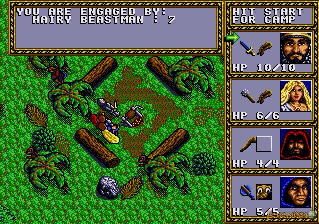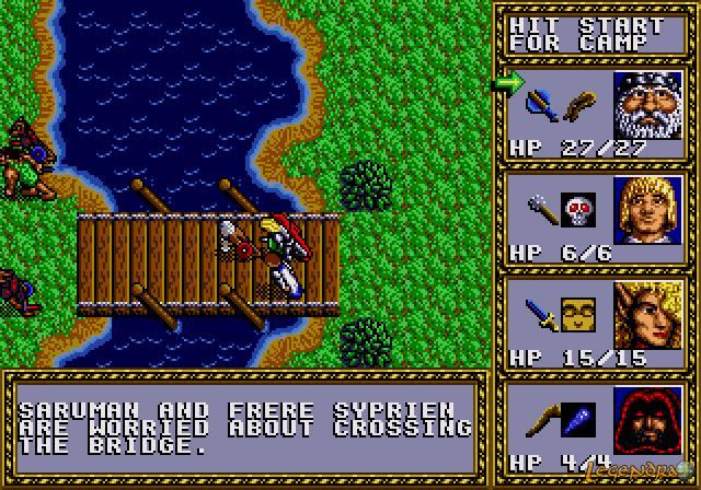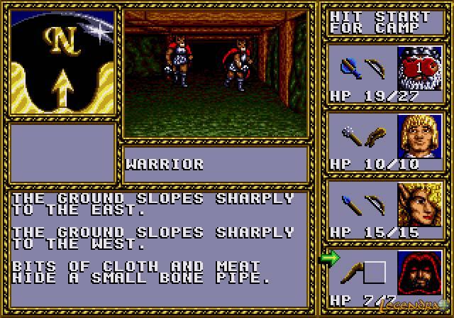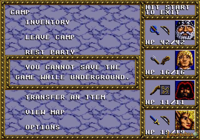 Les affrontements se déroulent eux aussi de manière différente une fois à l'intérieur des donjons. Finis les combats de type tactique et place aux combats temps réel. Une fois l'adversaire (situé dans des zones prédéfinies) débusqué, vous pouvez commencer à lui tirer dessus avec vos armes ou sorts à distance. Lorsque l'ennemi sera arrivé au corps à corps, celui-ci vous attaquera à intervalles réguliers. De votre côté, plus vous appuierez rapidement sur les touches d'attaques, plus vous porterez de coups à l'ennemi (attention à la crampe tout de même :p). Si les combats en extérieur étaient plutôt faciles, c'est assez différent en ces lieux sombres. Tout d'abord, il est impossible de sauvegarder une fois entré dans les donjons. De plus, il ne sera pas possible de vous reposer si des ennemis rodent dans les alentours. Pour finir, il arrive parfois que des ennemis que vous n'avez pas remarqué vous attaquent par derrière alors que vous êtes déjà en plein combat. Tout ceci permet de donner un peu de piment à l'aventure mais pourra aussi vous irriter rapidement si vous venez à mourir trop souvent. Le jeu ne proposant pas d'équiper à l'un de vos personnages un quelconque sort de résurrection, la mort d'un des membres de l'équipe aboutira souvent en la mort de toute l'équipe et en écran de Game Over si vous ne rebroussez pas chemin. En effet, dans la plupart des cas, la seule possibilité de faire revivre un personnage sera de rentrer au château et de solliciter l'aide du prêtre de l'église. Des graphismes qui font honneur à la MegadriveQue ce soit les phases en extérieur ou en intérieur, les graphismes sont assez réussis et agréables. Le jeu exploite bien la Megadrive et nous offre des détails assez fins. Le monde proposé est varié et le rendu est assez réaliste, ceci facilite l'immersion du joueur et donne envie de découvrir l'univers de fond en comble. Du côté des donjons, on regrettera que la fenêtre principale soit minuscule ainsi que les trop grandes ressemblances entre ceux-ci (plusieurs donjons ont les mêmes décors mais avec des couleurs différentes). Passé ces points, les ennemis rencontrés dans les donjons sont réussis et de beaux artworks apparaîtront lors des rencontres cruciales.