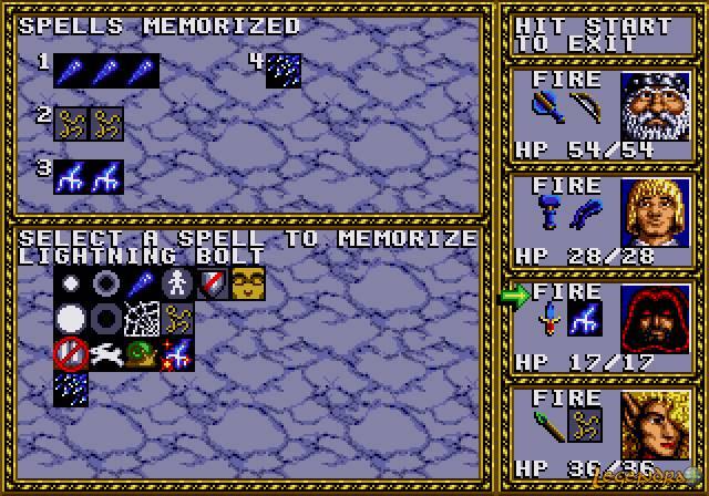 L'atmosphère si particulière des D&D se retrouve aussi au niveau des combats. Le célèbre système THACO (To Hit Armor Class Zero) est utilisé et tout est géré de façon automatique. Sans rentrer dans les détails, plusieurs facteurs (classe du personnage, niveau, armure...) entrent en jeu pour déterminer la probabilité qu'un coup atteigne sa cible. Dès les premiers affrontements on s'aperçoit que les attaques sont loin de toucher leur but à chaque fois. Du côté des magies, le système de gestion retenu est vraiment atypique. En effet, lancer des sorts ne vous coûtera pas de points de magie mais en contrepartie ils ne pourront être utilisés qu'un certain nombre de fois. Pour pouvoir les recharger, il faudra obligatoirement vous reposer. Ces phases de repos seront donc des étapes essentielles durant votre aventure. Premièrement, les magiciens ainsi que les elfes pourront inscrire dans leur grimoire (si leur niveau le leur permet) les parchemins récupérés durant leur périple. De plus, vous pourrez recharger les sorts des mages et ecclésiastique en sélectionnant dans leur liste un certain nombre d'entre eux afin qu'ils les mémorisent pour la suite de l'aventure. Cette trêve sera aussi l'occasion de régénérer les points de vie des personnages de votre équipe. Un peu de tactique...Lors de l'exploration de la carte, vous dirigerez votre groupe en vue du dessus. Lorsque vous ferez face à un habitant ou un objet, vous interagirez automatiquement avec lui. Ces phases d'exploration vous seront primordiales pour partir à la découverte des lieux intéressants tels que les donjons et les cavernes.