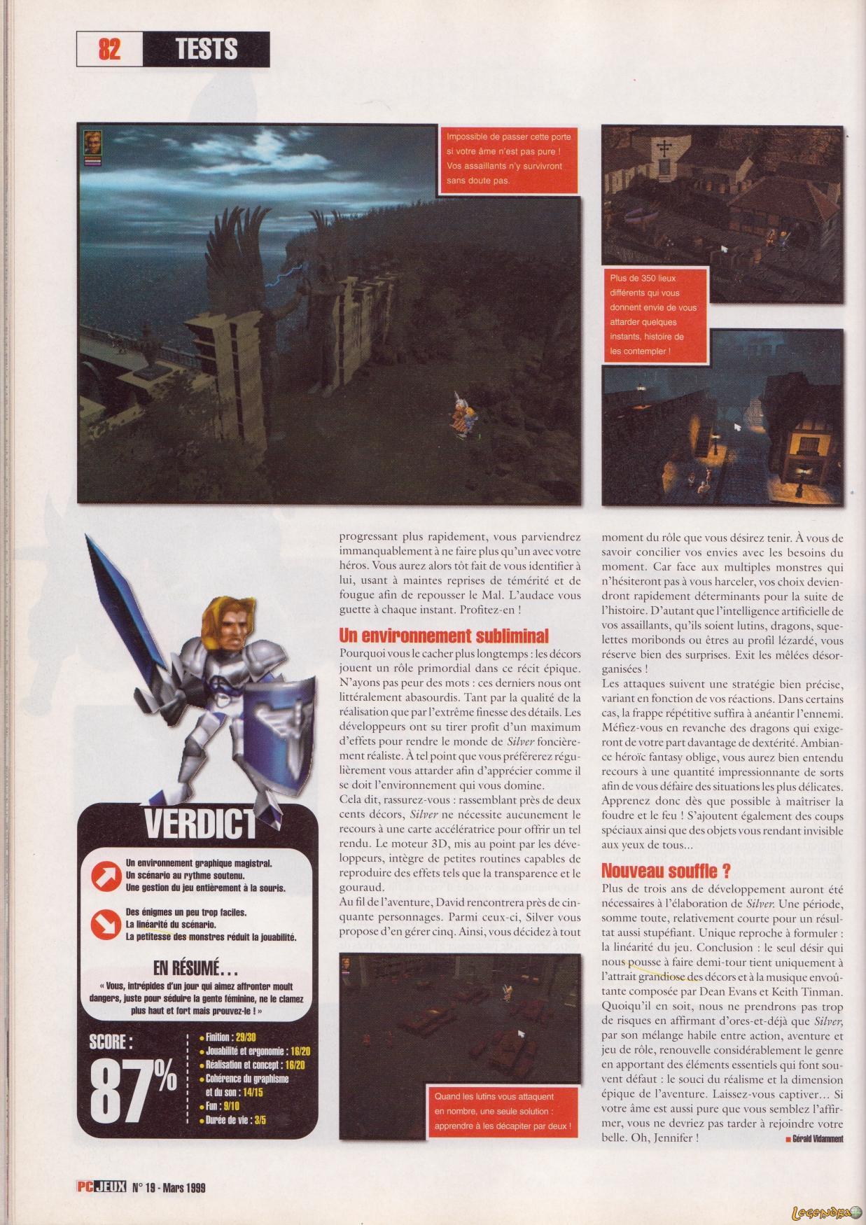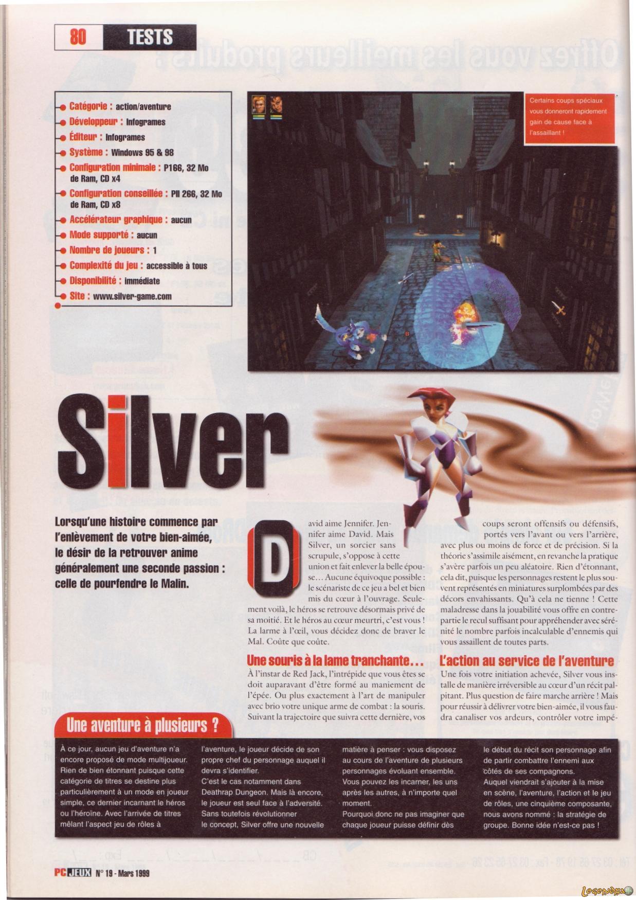 Silver est un action-RPG créé par Infogrames à la fin des années 90 sur PC puis Dreamcast. Ce jeu se déroule dans un univers très heroïc-fantasy qui se déleste de l'austérité caractéristique des jeux de rôle américains (Baldur's Gate pour n'en citer qu'un). D'ailleurs, Silver est l'un des rares softs ayant été apprécié à sa sortie par les joueurs consoles.
