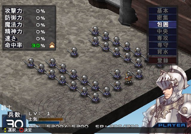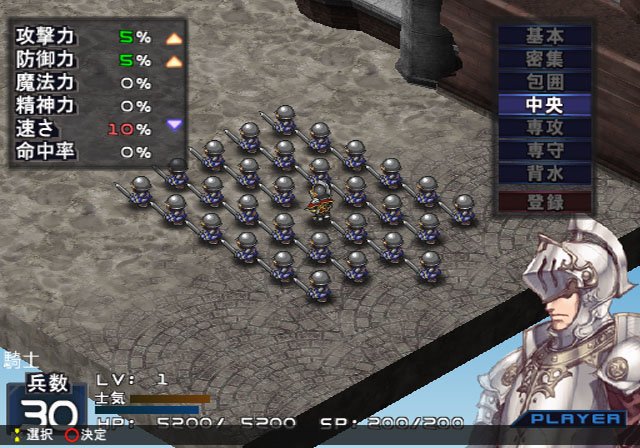 Le but de chaque mission est de prendre le contrôle de la base principale adverse ou vaincre le leader. Pour ce faire, le joueur dispose de cinq actions de déplacement par tour qui permettent soit d'aller combattre une troupe adverse (en se positionnant sur la même case), soit de prendre le contrôle des points intermédiaire entre les bases, le tout sur des cases. A la manière d'un T-RPG chaque troupe peut se déplacer plus ou moins loin, mais aussi plus ou moins haut (il y a du dénivelé). Les points intermédiaires et bases sont essentiels pour plusieurs raisons. On peut s'en servir pour construire des bâtiments : hôpital pour se régénérer entre les tours ou cimetière pour empoisonner les ennemis par exemple, les choix ne manquent pas dans les deux sens, et il est essentiel de bien s'en servir pour arriver à ses fins sans encombre. De plus, un capitaine peut "explorer" les bases et les points intermédiaires. Si la majeure partie du temps cela donne lieu à un combat, c'est par ce biais que se récupère les persos et les équipements les plus puissants du jeu. Ce sont aussi les seuls endroits où l'on peut changer les équipements/troupes/skills des capitaines, d'où l'importance de bien gérer sur la carte entre les missions et convaincre les ennemis de rejoindre nos rangs. Si capturer un ennemi est trivial (il suffit de défaire un ennemi capturable), les convaincre peut se révéler plus difficile, et le pourcentage de réussite va dépendre du charme du personnage utilisé (CHM) et de l'endroit d'où il essaie (sur place, le pourcentage sera maximum). Une fois qu'une troupe se déplace sur une case contrôlée par un ou plusieurs ennemis, on bascule dans un combat. Le principe est connu des amateurs de RPG stratégique. D'abord, on choisit sa formation. Ensuite, on démarre le combat et on peut influencer la direction prise par les troupes à tous moments. Enfin, pendant le combat on utilise les compétences de son capitaine (ou de son allié, au choix, j'y reviendrai) pour se simplifier la tâche. Le peu de contrôle sur les troupes et les capitaines eux-mêmes pourra dérouter les néophytes, mais c'est la base du RPG stratégique. Si plusieurs unités se trouvent sur la case, les combats s'enchaînent, il faut donc bien prévoir son coup et ne pas envoyer la première daube venue en priant. Lorsqu'une unité est défaite, plusieurs cas de figures se présentent. Les capitaines importants du scénario se replient, et ne seront pas disponibles avant la prochaine mission. Pour les autres, soit le capitaine est fait prisonnier, et pourra être sauvé par la prochaine unité envoyée, soit le capitaine déserte tout simplement le camp. Heureusement, la sauvegarde à tout moment permet de ne pas perdre ses unités à tout va en cas de coup mal géré, la PSP ne devrait pas être jetée trop souvent par la fenêtre.