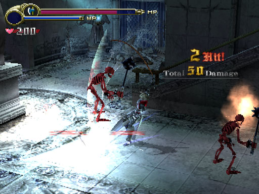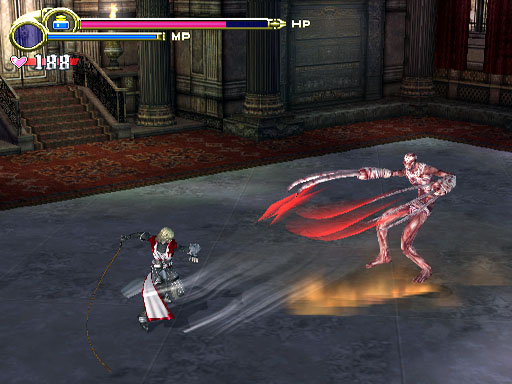 On retrouve le gameplay classique de la série depuis SotC : équipement (fouets, armures et accessoires), les reliques, les subweapons (dague, hache, croix, etc.) couplées cette fois à des orbes colorés pour modifier l'attaque et l'inventaire plein de potions, joyaux et plats exotiques. La seule chose différente est l'absence d'XP qui du coup n'oblige pas le joueur à tout nettoyer (même si l'on est enfermé dans les salles la première fois qu'on y entre). On couple tout ça à des contrôles bien rigides, même pour l'époque et on a un sentiment un peu amer en bouche.