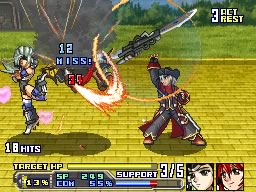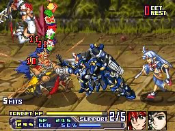 Je suis d'accord avec anhhoi sur toute la ligne. Ce Super Robot Taisen est sympathique, les personnages ont du charisme (et des fortes poitrines, mais l'un n'équivalant pas forcément à l'autre), et les combats sont dynamiques. Lors des affrontements les sprites sont grands et parfaitement animés, on enchaîne les combos dévastateurs et classes. Enchaîner les attaques nécéssite d'appuyer au bon moment sur le bouton d'attaque afin d'éviter que l'adversaire touche le sol et puisse bloquer nos coups et contre-attaquer. On peut, en plus, appeler successivement les personnages pour faire un combo à la chaîne le plus long et destructible possible. Bref, ça tape de tous les côtés, les attaques dégagent un véritable sentiment de puissance et c'est plutôt amusant. Malheureusement cette formule s'essouffle et devient répétitive. Déjà, le scénario est linéaire et pas très intéressant. On se tape des donjons très basiques (comprendre level design sans génie), peuplé d'un nombre important de boss. Par moment, on a un peu l'impression de ne combattre que des boss. Enfin, "des boss", en fait ce sont des personnages secondaires qui reviennent sans arrêt même après les avoir déjà rousté 2 ou 3 fois (à chaque fois ils s'enfuient à la fin du combat). Au bout de la troisième fois on en a un peu marre de se battre contre les mêmes ennemis. En plus les affrontements contre les boss sont assez longs car ils sont en général accompagnés de seconds couteaux et ont une barre de vie assez conséquente (sans parler de ceux qui se régènerent un peu à chaque tour). Pourtant, une fois qu'on a pris le pli et qu'on reste attentif à la santé de nos personnages (les ennemis tuent souvent en une seule attaque), le jeu n'est pas très dur. En fait, c'est juste une question d'endurance. Et l'endurance c'est assez monotone. Le comble, je crois, c'est que tous les personnages que l'on affronte sont en fait gentils ! Tout le monde poursuit plus ou moins le même but (en fait il n'y a qu'un seul vrai méchant, celui qu'on affronte à la fin), on se croise, on se cause, voire on s'aide, mais il n'y a rien à faire : il faut que ça se finisse invariablement par une baston et plutôt deux fois qu'une. A la fin personne ne meurt et on se claque une tape dans le dos comme si on était les meilleurs amis du monde, après plus de trente heures de jeu passées à se foutre sur la tronche. Bref, ce Super Robot Taisen est plaisant, rempli de petites pépées aguichantes qui se trémoussent dans tous les sens (ce qui est le sujet d'un flot de remarques d'un goût parfois douteux lors des dialogues), mais montre vite ses limites et a du mal à se renouveler.