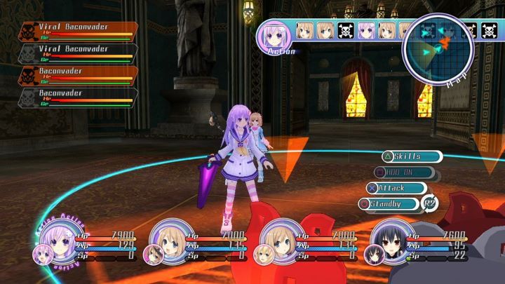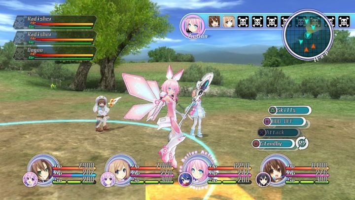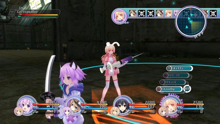 Dans l'action, vous avez une barre en haut de l'écran qui affiche l'ordre des tours et votre menu : skills, attaque, HDD, attendre puis un sous-menu avec switch, fuite et objets. La première étape consiste à déplacer vos personnages en temps réel selon une zone en cercle et de cibler l'ennemi en fonction de la portée de votre arme. Le menu de skills qui consomment AP et SP nécessitent un peu plus de préparation vu le coût des techniques et le HDD correspond aux transformations de certaines filles en super héroïnes à la forme classe et plus mature (équipement paramétrable). Ensuite vous pouvez attaquer grâce au système de combo issu du premier Neptunia et qui est régi par une jauge d'AP. A ce titre les combos sont calés sur trois touches à appuyer en rythme, au préalable après les avoir validé dans le menu hors combat (certaines combinaisons permettent, si vous avez suffisamment de points, de déclencher des skills spéciaux très utiles).