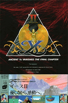 La suite de l'illustre Book 1 de Y's. Personnellement même si j'adore ce jeu, je n'aime pas beaucoup cette version NES. elle est sortie en japonais uniquement mais il existe un patch qui fonctionne parfaitement. Du reste les graphismes NES sont vraiment trop horribles et je ne suis jamais arrivé à m'y faire. Les coulleurs baves et sont particulièrement mals choisies. Cependant si vous voulez jouer à la suite de la très bonne version master system et connâitre la fin de cette histoire tout en conservant l'esprit des graphismes master system de l'époque, c'est cette version qu'il vous faut. Le jeu reste d'un intérêt, les environnements sont variés et les musiques sympas. en revanche ce seul Book2 est court. mieux vaut jouer les deux livres dans la foulée. Et sinon essayez Ys Eternal, sur pc, c'est du bonheur et les graphismes sont magnifiques.