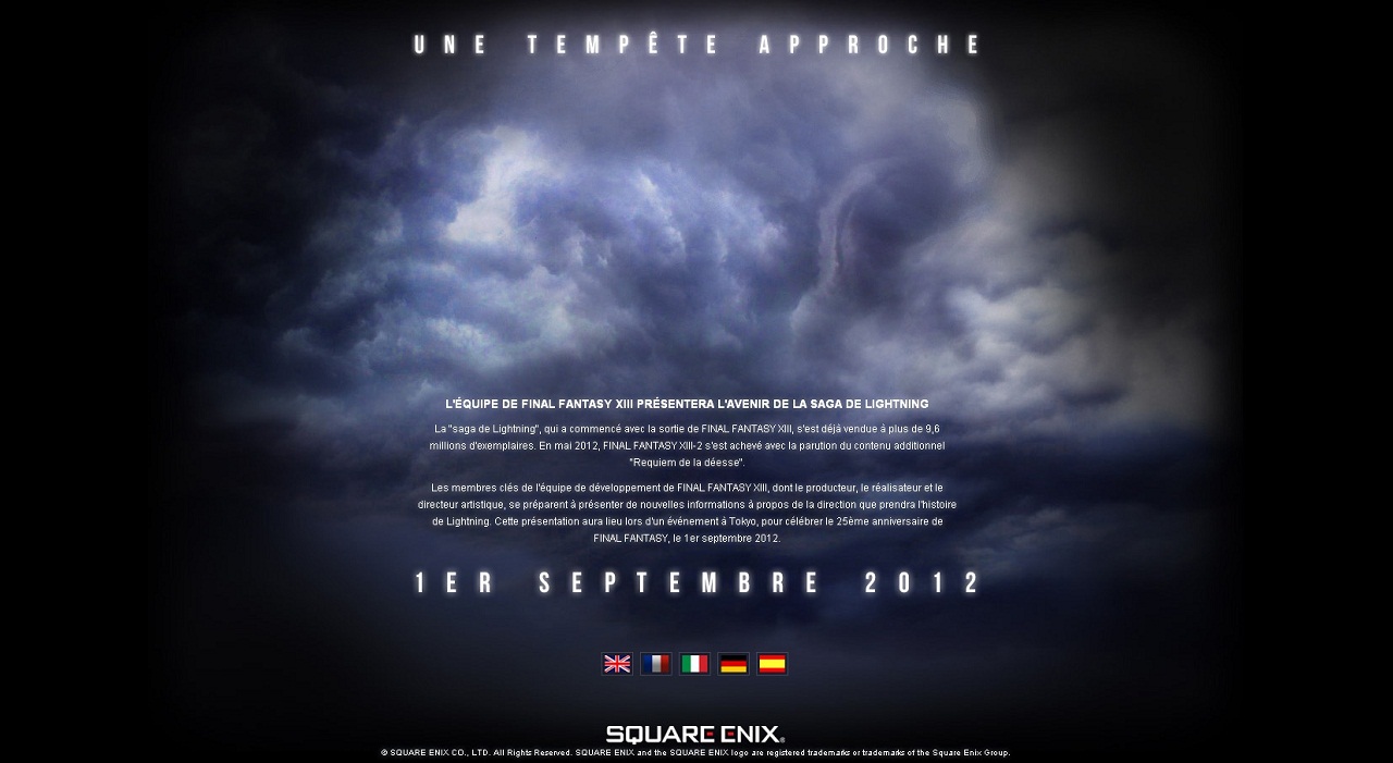 "Requiem de la déesse". Les membres clés de l'équipe de développement de FINAL FANTASY XIII, dont le producteur, le réalisateur et le directeur artistique, se préparent à présenter de nouvelles informations à propos de la direction que prendra l'histoire de Lightning. Cette présentation aura lieu lors d'un événement à Tokyo, pour célébrer le 25ème anniversaire de FINAL FANTASY, le 1er septembre 2012.
