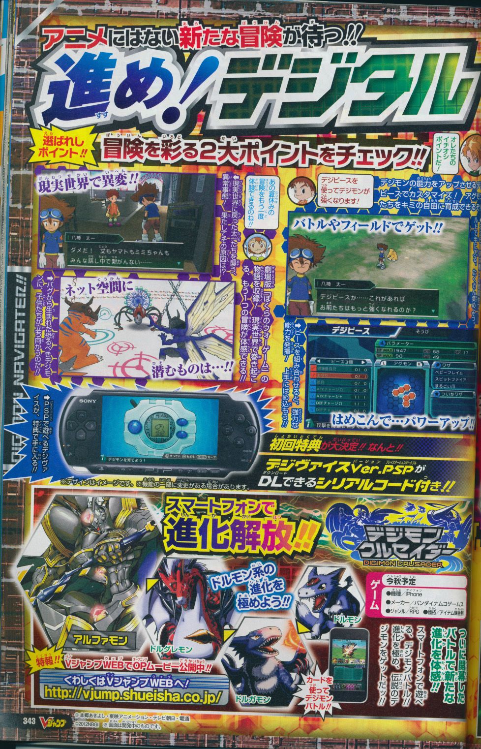 Namco Bandai vient de donner la date de sortie de Digimon Adventure PSP, l'épisode PSP qui retracera la toute première saison des petits monstres digitaux. Ça sera le 17 janvier 2013. A noter que via des scans du V Jump circulant sur le net, on apprend que le jeu disposera d'un scénario bonus une fois le jeu terminé au moins une fois, scénario bonus qui semble t-il va impliquer les héros des autres saisons de l'animé.