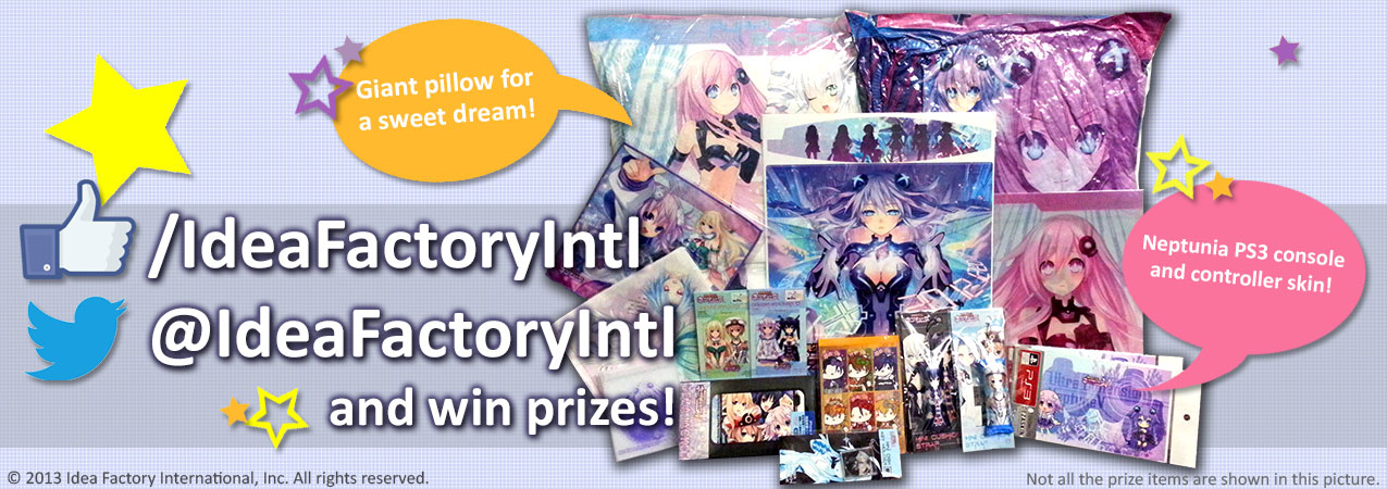 Un site qui a donc pour vocation d'informer, de communiquer autour de toutes les licences Idea Factory, aussi bien en Amérique qu'en Europe, avec en prime la collaboration des principaux éditeurs gravitant autour du développeur (Aksys Games, NIS America, Ghostlight et Rising Star Games pour ne pas les citer). Images, animes, jeux vidéo, applications smartphone, tout ce qui touche à l'univers Idea Factory passera par ce site web, avec bien sûr l'idée de faire connaitre la marque et de renforcer sa présence à travers le monde. Un lancement qui se fait également avec des cadeaux, puisque Idea Factory s'associe à NIS America pour une petite "loterie" à l'échelle mondiale. La règle est simple, vous vous rendez sur le Facebook ou le Twitter de Idea Factory International, vous "likez"/vous abonnez au compte, et vous serez peut-être l'un des dix gagnants tirés au sort. Sont à gagner des éditions limitées de Hyperdimension Neptunia Victory (PS3), Hello Kitty & Friends (3DS, version PAL) et Hakuoki: Memories of the Shinsengumi (3DS, version PAL), un code Steam pour Agarest: Generations of War, un oreiller géant Neptunia, un autocollant décoratif Neptunia pour PS3 et des bloc-notes Hakuoki et Hello Kitty.