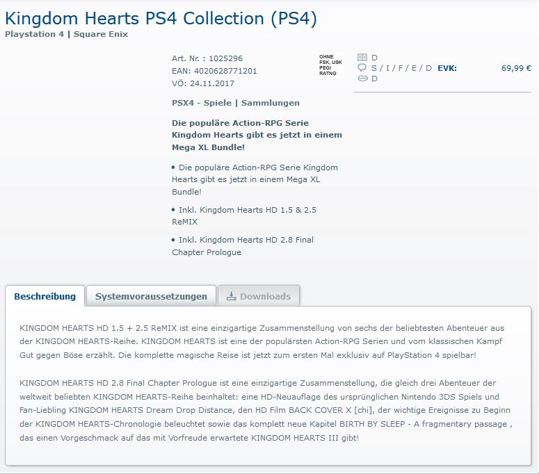 Ainsi selon les boutiques allemandes de Koch Media et Amazon, Square Enix est en train de nous mijoter la Kingdom Hearts PS4 Collection, qui comme son nom l'indique est prévue pour la PS4, avec une sortie prévue le 24/11/17. Avec au programme :